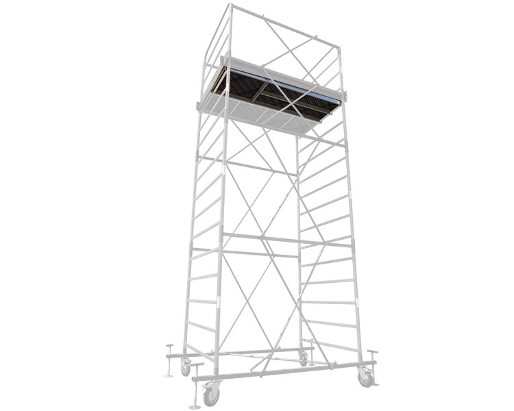 The flooring without a hatch for the PROFITEC VIRASTAR 1.35x2.0 scaffold tower is made of moisture-resistant plywood on an aluminum frame.