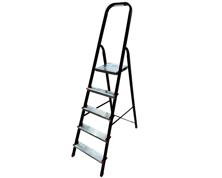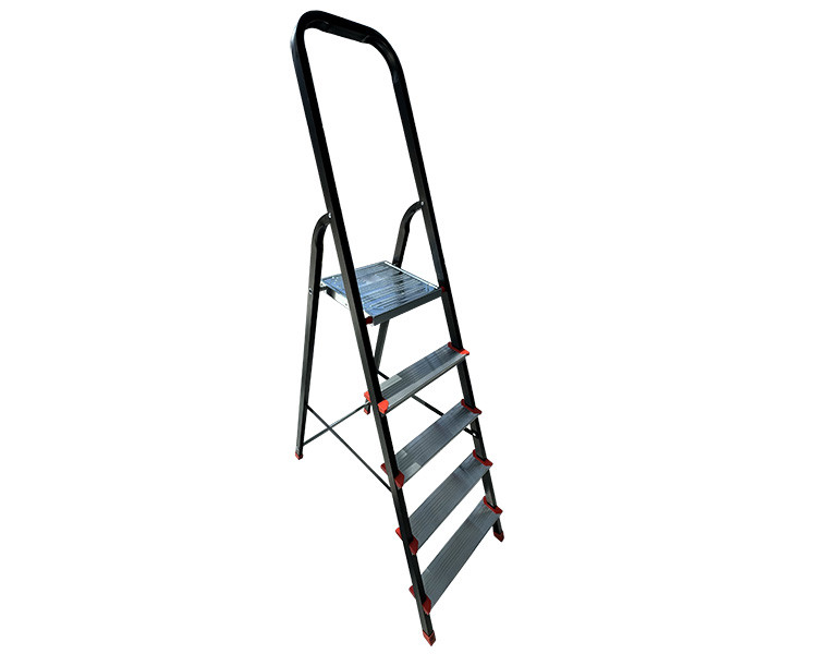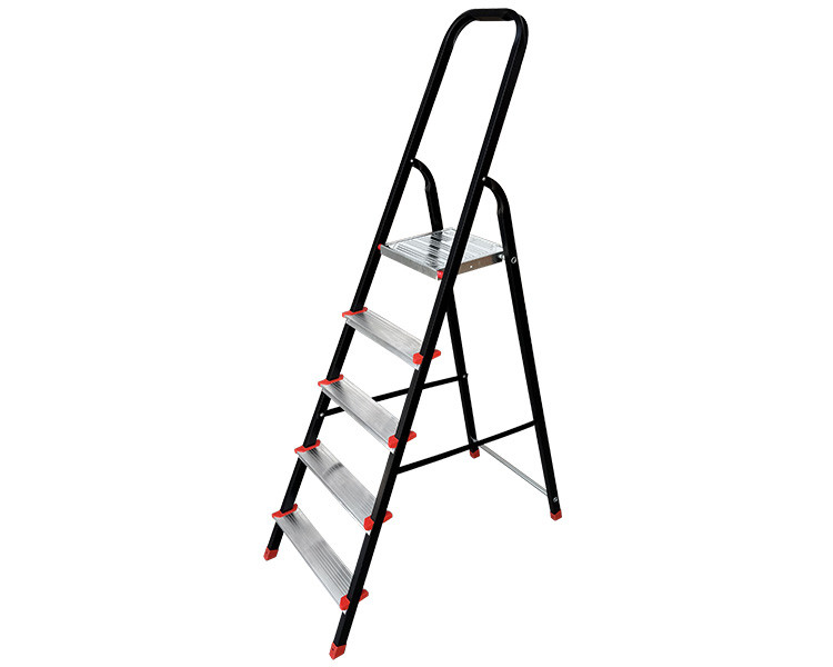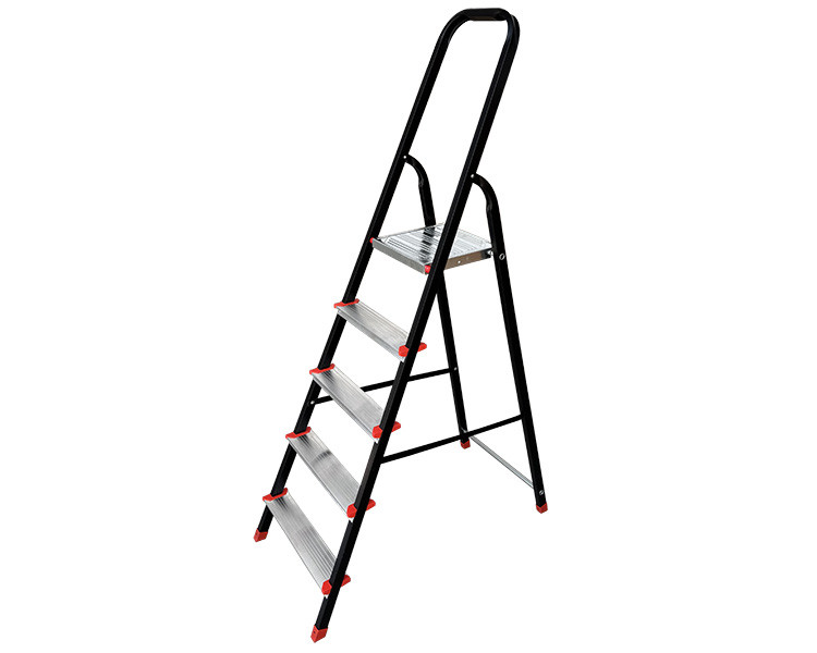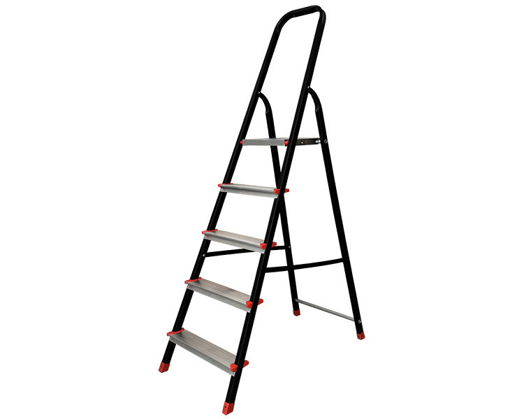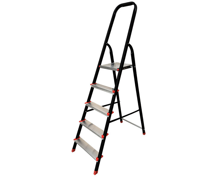 - алюминиево-стальная стремянка VIRASTAR NOVA STEEL 5 ступеней имеет защитные заглушки красного цвета с торцов ступенек;