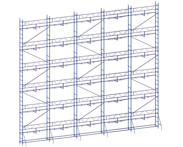A set of wedge-clamp scaffolding 15x17.5 (M) VIRASTAR with an area of 262.5 sq. m. The width of the flooring is 0.7 m, the step of the ladder racks along the wall is 3.5 m.