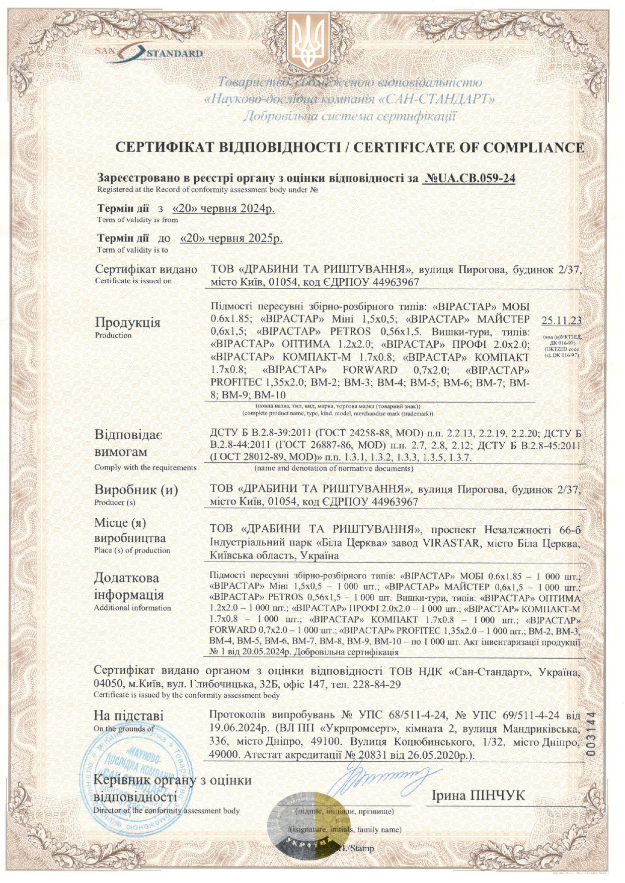 - вишка-тура VIRASTAR "КОМПАКТ-М" відповідає ДСТУ;